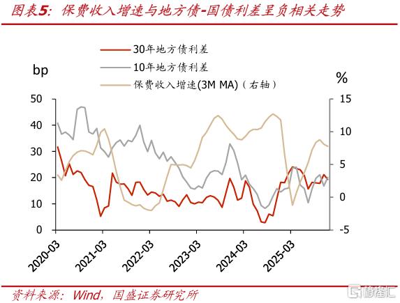 险资是利率债的重要配置力量之一,保费收入上涨扩大了险资配债资金规模,推动地方债-国债利差收窄。保费收入增速反映险资可运用资金的边际变化,保费增速走弱意味着 险资增量配置能力下降,通常会削弱对地方债的承接,从而推动地方债-国债利差走阔; 反之保费增速回升则有利于利差收敛。从存量持仓看,保险机构是地方债的重要配置力 量之一,截至2025年12月,保险机构持有地方政府债2.6万亿,占比5%、是仅次于 商业银行、非法人产品的第三大地方债配置力量。在10年期国债收益率处于历史低位、 票息安全垫变薄的背景下,当保费收入增速回升带来资产端增配需求时,险资更可能优 先配置久期更合适、收益率略高、波动相对可控且有税收优惠的地方债,地方债因此更 容易获得边际增量资金,利差倾向收敛。从历史走势看,保费收入增速(3M MA)与10 年、30年地方债利差整体呈现反向变化。