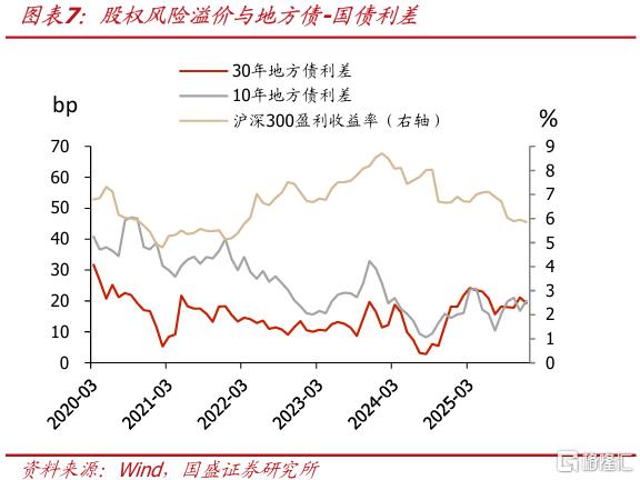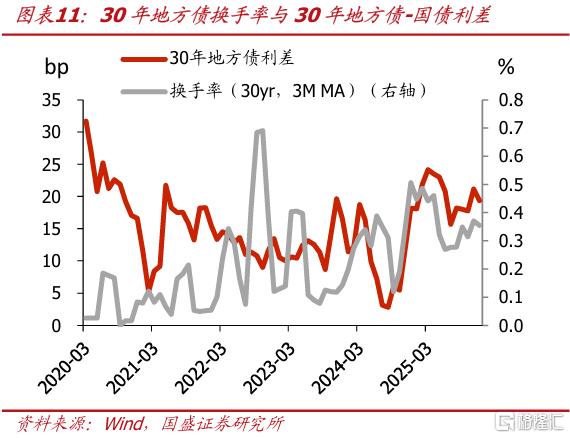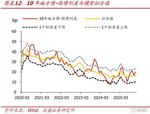 对2026年各解释变量进行估计以预测后续利差走势。2026年,预计10年期国债收益 率维持2025年均值水平,资金价格中枢下行、DR007进一步下行至1.35%左右,保费 收入同比增速相比过去两年上行3个百分点,股权风险溢价指标相对过去1年均值上调 5%,7年以上、10年以上地方债净融资小幅上行至7万亿、5万亿,10年/30年地方债 换手率维持2025年均值,对应2026年10年、30年地方债-国债利差均值分别为14.3bps、 14.9bps,均低于当前利差水平,显示后续地方债利差继续上升风险有限。