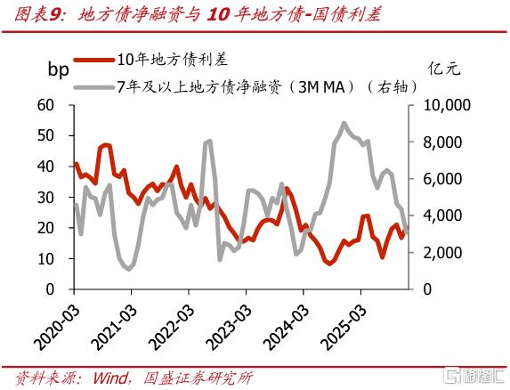 长久期地方债净融资通过供给冲击,对不同期限地方债-国债利差形成差异化影响:超长 端供给放量通常会抬升出清压力,推动30年地方债利差走阔,而对10年利差而言, 这种关系则较为不明显。从图形走势看,30年地方债利差与10年以上地方债净融资(3M MA)整体呈现较为直观的同向变化,尤其在2024年下半年以来,长端净融资明显抬升 并维持高位,30年地方债利差也自低位快速走阔,反映供给放量对超长端边际定价的压 制更为直接。相比之下,10年地方债利差与地方债净融资的关系则不那么稳定,部分时 间段二者反而呈现出反向变动,10年地方债利差或受其他因素扰动影响更大。