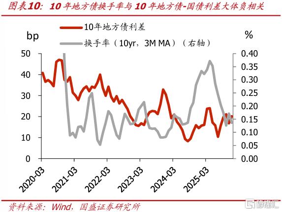地方债-国债利差受无风险利率锚、资金成本、机构行为、风险偏好、地方债供给、交易与流动性等多方面因素影响。(1)无风险利率锚:无风险利率上升时,各期限国债收益率率先变动,地方债收益率随后调整,其调整速度和幅度受自身流动性、供需和信用风险溢价的影响,利差因此发生变化。由于上述传导存在摩擦和时滞,利差与国债收益率通常呈反向关系。(2)短期资金成本:DR007上行意味着短端资金成本抬升,市场边际承接能力下降,因此市场更偏好流动性更好、对冲更便利的国债,使得地方债-国债利差走阔。(3)保险保费收入:险资是利率债的重要配置力量之一,保费收入上涨扩大了险资配债资金规模,推动地方债-国债利差收窄。(4)风险偏好:2025年7月以来,A股明显走强。股债跷跷板效应下,市场对债券的投资热情下滑,债券收益率也随之明显调整,其中地方债收益率上行幅度更大,导致地方债-国债利差走阔。(5)地方债净融资:长久期地方债净融资对不同期限地方债-国债利差形成差异化影响,超长端供给放量通常会抬升出清压力,推动30年地方债利差走阔,而对10年利差而言,这种关系则较不明显。(6)换手率:地方债换手率提高意味着债券交易活跃度上升、流动性增加,流动性溢价提高,理论上会推动利差压缩。