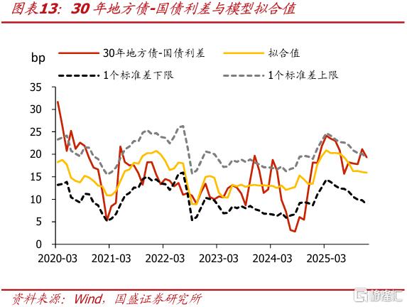当前10年地方债-国债利差与拟合值较为接近,但30年利差则明显高于拟合值,显示超长端地方债存在一定程度超跌,继续上行空间有限,具备一定配置价值。从模型拟合 值来看,无论是10年还是30年,实际利差均基本上围绕拟合值上下一个标准差运行, 显示模型对实际利差有较高解释能力。当前10年、30年地方债-国债利差拟合中枢值分 别为16bps、16bps左右,上限分别为23bps、21bps左右,10年地方债-国债利差仍保持在上下一个标准差区间内,但30年地方债-国债利差已大幅偏离拟合值且突破了一个 标准差上限,显示超长端地方债存在一定程度超跌,利差继续上升空间有限。