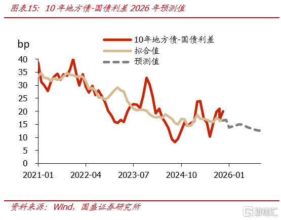 对2026年各解释变量进行估计以预测后续利差走势。2026年,预计10年期国债收益率维持2025年均值水平,资金价格中枢下行,保费收入同比增速上行,股权风险溢价指标小幅上行,地方债净融资小幅上行,10年/30 年地方债换手率维持当前水平,对应2026年10年、30年地方债-国债利差均值分别为14.1bps、14.9bps,均低于当前利差水平。