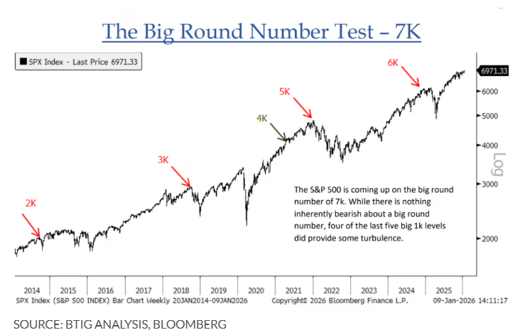BTIG研究公司的历史数据也显示,标普500在逼近整数大关时往往会出现波动。该机构首席市场技术分析师乔纳森·克林斯基周三在客户报告中写道:“尽管整数关口本身没有什么看跌含义,但过去五次中的四次每上一个1000点关口时,市场都出现了波动。”
