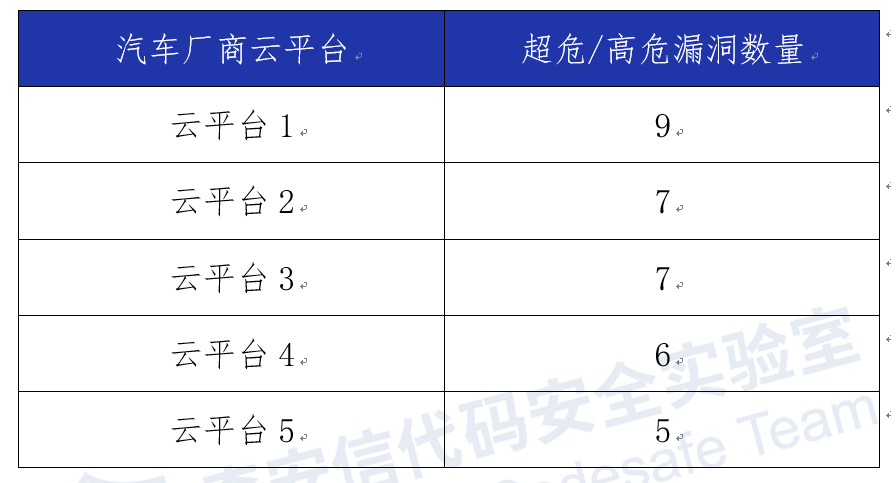 在漏洞总体状况方面,超七成厂商云平台存在超危或高危漏洞,安全风险极高30家汽车厂商云平台中,有23家存在超危/高危漏洞,占比高达76.7%,这些漏洞可直接导致未授权解锁车辆、未授权驾驶车辆、敏感信息泄露等严重后果。超危/高危漏洞数量最多的厂商云平台存在9个超危/高危漏洞,前5名厂商累计存在34个超危/高危漏洞。