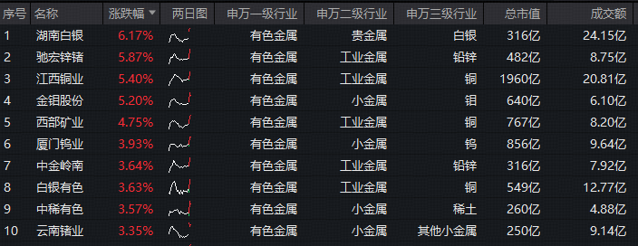 成份股方面,湖南白银领涨超6%,驰宏锌锗、江西铜业、金钼股份涨逾5%,西部矿业、中金岭南、白银有色等个股跟涨。权重股方面,洛阳钼业、北方稀土涨超2%,紫金矿业、中国铝业飘红