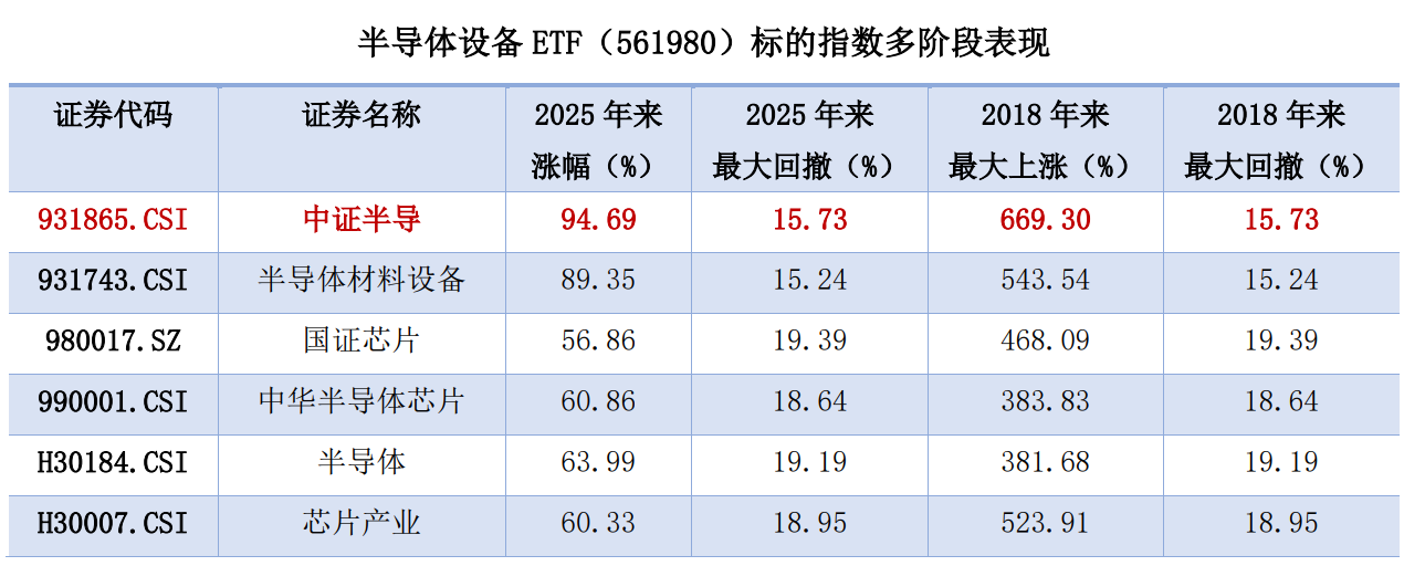 半导体设备ETF(561980)跟踪中证半导,由于对国产设备、材料和设计龙头高度聚焦,该指数较同类指数呈现更高弹性——2025年至今涨幅94.69%、上一轮半导体周期(2018年)至今最大涨幅近670%,均在同类指数中位居第一。