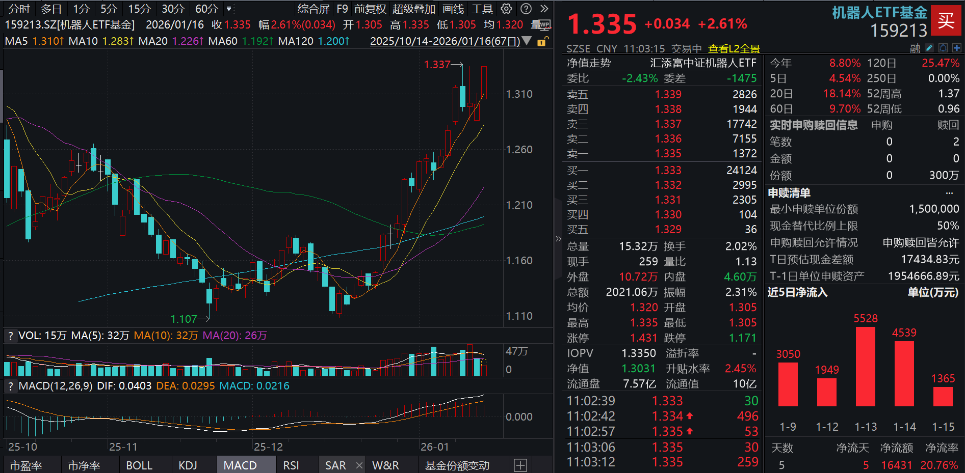 1月16日,A股市场震荡上行,硬科技板块继续冲高,截至11:00,机器人ETF基金(159213)大涨超2.6%,冲击前高!