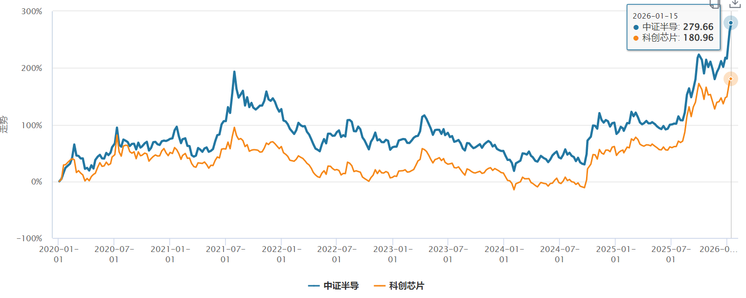 从长期表现看,中证半导体设备指数从2020年1月至今累计涨幅高达279.66%,大幅跑赢同期的科创芯片近100%。
