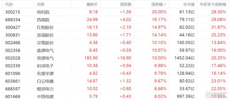 截至发稿,电科院20CM涨停,汉缆股份、广电电气、森源电气、日丰股份、思源电气等多股涨停。