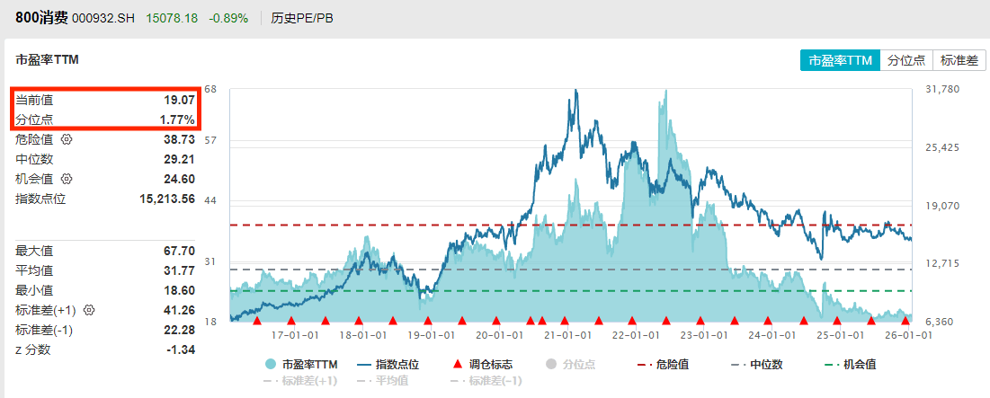 当前市场热点轮动加速,资金高低切换!聚焦大消费板块,其估值性价比仍极具吸引力。截至1月15日,消费ETF(159928)标的指数市盈率TTM为19倍,处于近10年1.77%分位点,比近10年历史上超98%的时间便宜,估值性价比更高!