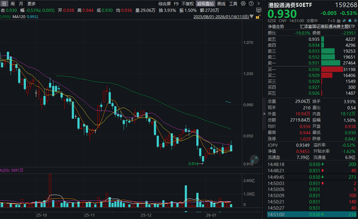 今日(1.16),沪指再度震荡小跌,大消费连续第四日回调,消费ETF(159928)跌超1%,盘中成交额已超7.5亿元!资金持续涌入,盘中净申购4.74亿份,此前5日更是累计“吸金”超14.5亿元!
