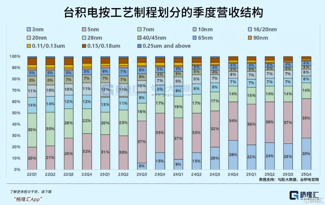 其最先进的3纳米、5纳米和7纳米制程,合计贡献了总营收的77%,其中3纳米和5纳米更是占据了63%的江山。