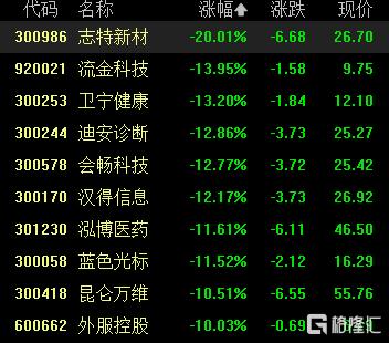 AI应用板块大跌,志特新材20cm跌停,流金科技、卫宁健康跌超13%,会畅科技、汉得信息跌超12%。
