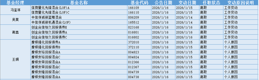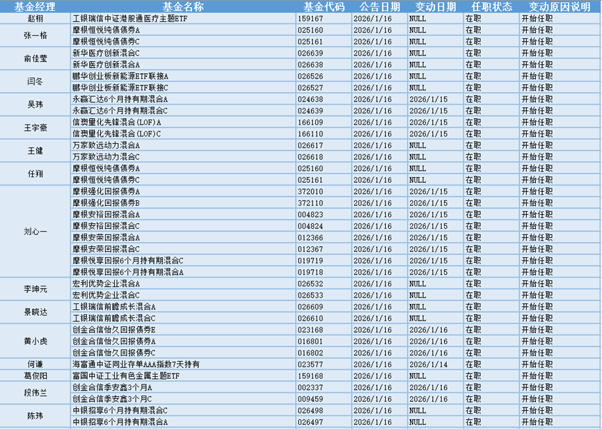 基金经理是一只基金产品最核心的成员,能决定一只基金的投资方向、投资策略以及投资风格,基金经理出色的择时选股能力和调研预测能力是基金业绩的有力保证,所以基金经理是投资者在选择基金产品时的重要依据。基金经理的变动很大程度上会影响到基金产品未来的表现,是一个需要特别关注的信息。1.16日共有20位基金经理发生任职变动。
