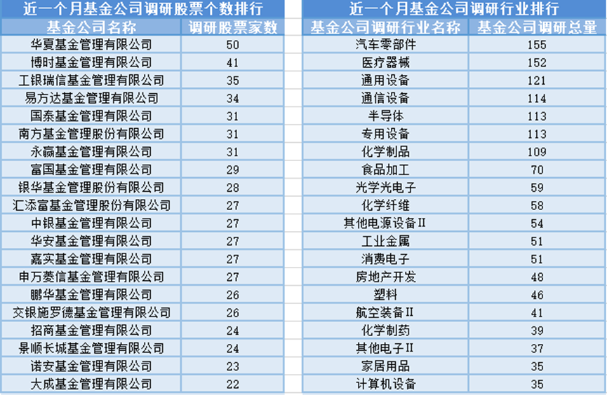 近一个月(12月17日-1月16日),华夏基金参与公司调研的数量最多,共调研50家上市公司,此外调研较为活跃的还有博时基金、工银瑞信基金和易方达基金,分别调研41家、35家、34家上市公司;从调研行业上来看,基金公司对汽车零部件行业的上市公司调研次数最多,共有155次,其次是医疗器械行业,基金公司调研了152次。