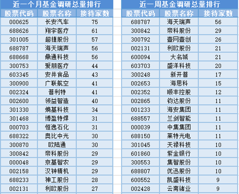 从个股调研情况上来看,最近1个月(12月17日-1月16日)最受公募基金关注的是长安汽车,长安汽车属于汽车制造行业,主营业务为整车研发、制造和销售以及发动机的研发、生产。共有75家基金管理公司参与调研,其次是翔宇医疗和超捷股份,分别接受61家、57家基金管理公司的调研。