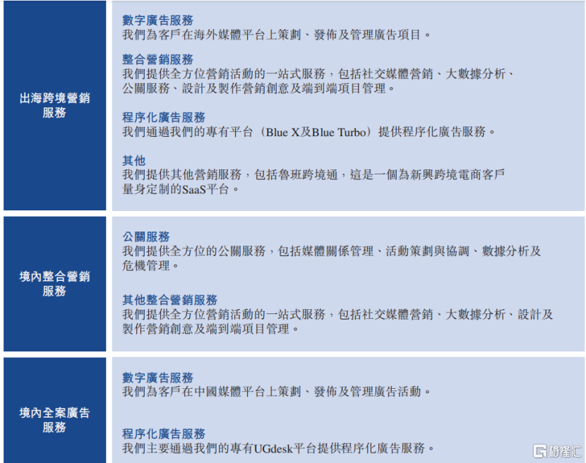 其他整合营销服务。公司为客户提供覆盖全部营销活动的一站式服务。其中包括社交媒体营销、大数据分析、设计及制作营销创意以及端到端项目管理。