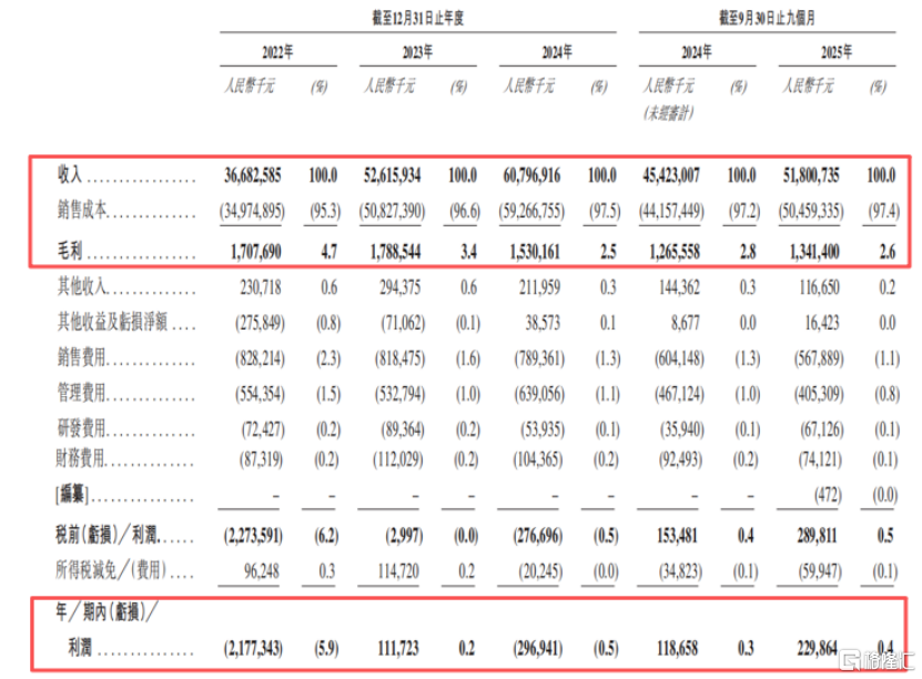 毛利率不足5%,2022年及2024年净利润为负