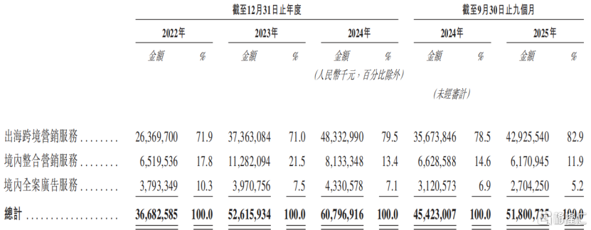 2025年1-9月,公司来自出海跨境营销服务的收入占比达82.9%,较2022年的71.9%大幅提升。