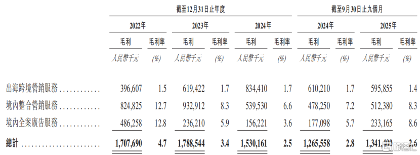 境内整合营销服务贡献的收入比重则由2022年的17.8%下降至2025年1-9月的11.9%。