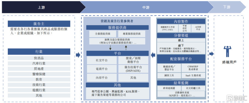中游分部包括执行营销及广告服务提供商,以及其他支持服务提供商。营销及广告行业参与者包括服务提供商、各种平台等(如公关公司和KOL公司等)。