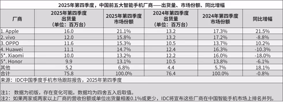 IDC数据显示,2025全年全球智能手机出货量达到12.6亿部,同比增长1.9%。报告称,苹果与三星成为前五厂商中增长最强劲的两家,同比增速分别达到6.3%和7.9%。苹果连续第三年稳居全球第一,并凭借iPhone 17系列在中国市场的成功表现,实现了历史新高的出货量。