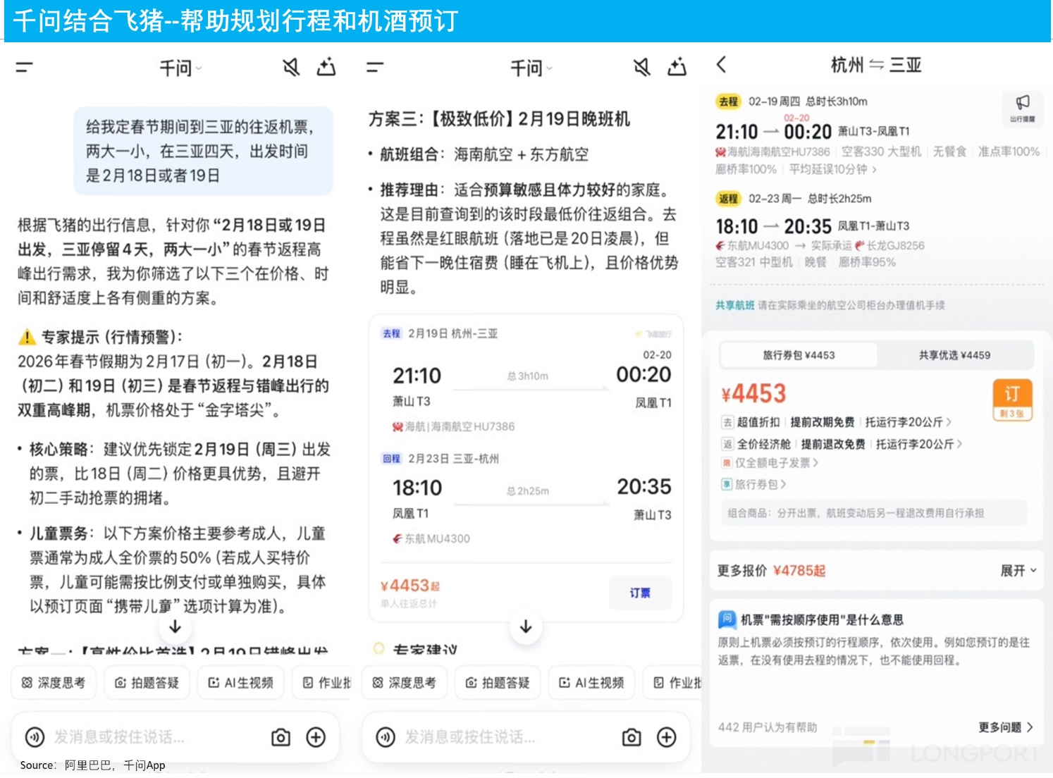 不过我们也注意到,由于此次千问 Agent 功能的更新是在较短时间内加急开发的,目前只有淘宝闪购能够在千问 App 内无跳转完成选择到支付的全流程。其他如淘宝电商,飞猪机酒目前仍是以卡片形式在千问 App 内展示,需要跳转到对应 App 内完成最终成交。