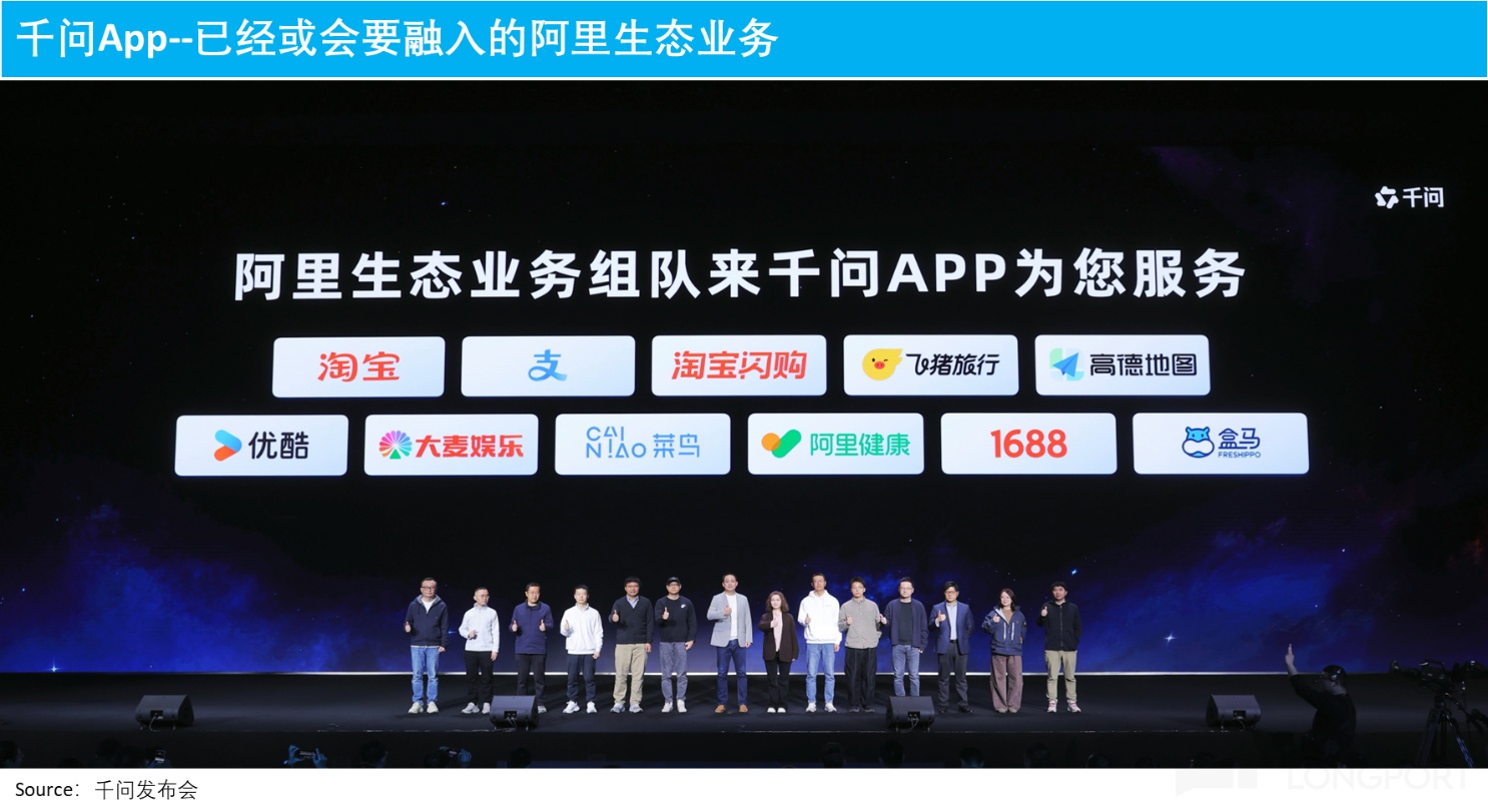 c. 千问的优势所在:显然,阿里和千问目前重要的优势是,阿里是中国互联网中 C 端消费业务布局最全的公司,电商、闪购、酒旅、导航/打车、商超、票务等等阿里都有自营。