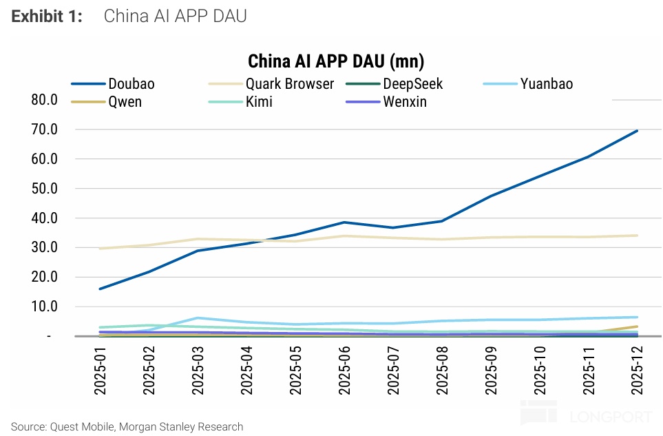 下图 Quest Mobile 统计到 12 月仅 App 渠道的 DAU 规模上,豆包约 7000 万,千问则应当未到 500 万。可见刚刚起步约 3 个月的千问和豆包的差距仍是巨大的。虽然生活助手的功能已经上线,其可靠性和可用性是不是足够给千问带来大量用户,需要时间观察。