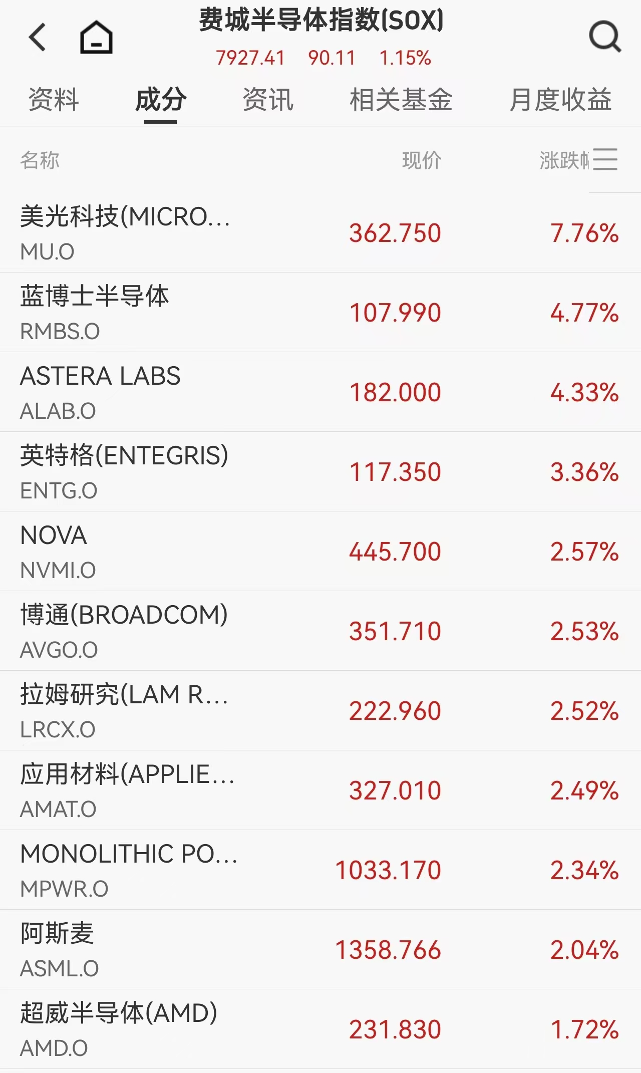 芯片板块的强势表现成为市场最大看点。费城半导体指数上涨1.15%,延续前一交易日的涨势。龙头股美光科技股价大涨7.76%,年内累计涨幅已超27%,总市值成功突破4000亿美元关口。推动其股价大涨的因素不仅包括高管增持780万美元公司股票所释放的对业绩前景的信心,还得益于公司当日为投资高达1000亿美元的内存制造综合体举行奠基仪式,该项目计划建设最多四座晶圆厂,建成后将成为美国最大半导体设施和全球最先进的存储制造基地,预计2030年投产。