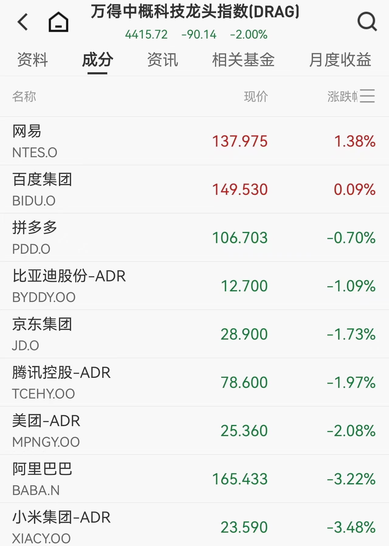 中概股则遭遇集体回调,纳斯达克中国金龙指数下跌1.15%,热门个股普遍走低。唯品会、世纪互联跌超8%,万国数据跌超6%,乐信、叮咚买菜跌超4%,阿里巴巴跌超3%,哔哩哔哩、京东、理想汽车、小鹏汽车等也均有不同程度下跌,不过该指数本周仍累计上涨0.32%。