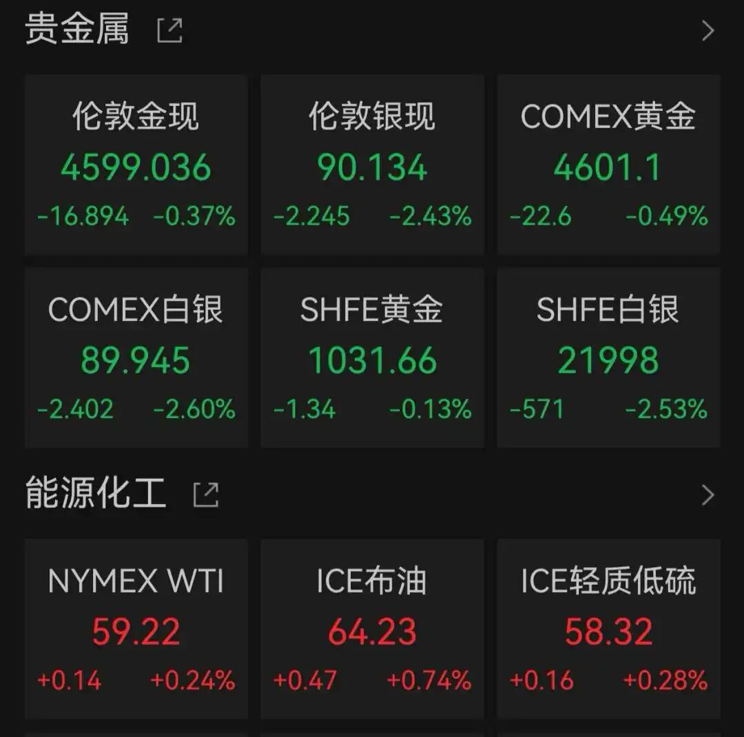 大宗商品市场波动剧烈,贵金属尤为抢眼。伦敦现货黄金、COMEX黄金期货盘中一度跌超1%,最终收盘分别下跌0.37%和0.49%;伦敦现货白银、COMEX白银期货盘中跌幅更是一度超6%,尾盘跌幅收窄至2%左右,现货白银一度失守87美元/盎司。广发期货宏观金融首席分析师叶倩宁表示,贵金属虽具备长期配置价值,但芝商所调整贵金属合约保证金计算方式,可能导致市场短期大涨大跌,投资者需做好风险控制。国际油价则小幅收涨,美国WTI原油期货上涨0.24%,ICE布伦特原油期货上涨0.74%,呈现出与贵金属市场的反向走势。