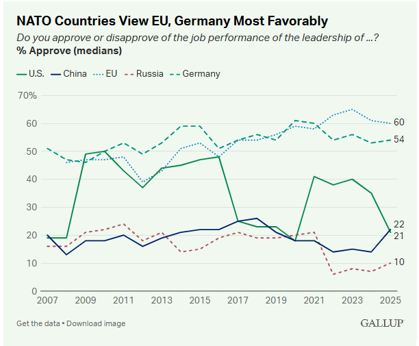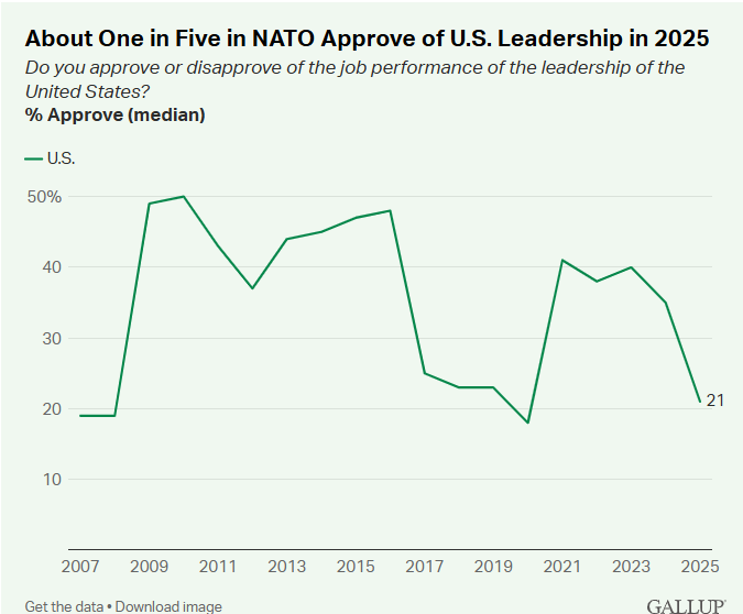 盖洛普民意调查显示,2025年,美国在北约盟国中的形象明显下滑,在31个国家中,美国领导力的中位支持率下降了14个百分点,降至21%。