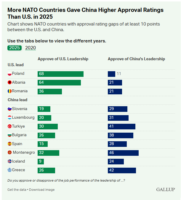 盖洛普最新数据显示,2025年美国在北约成员国中的支持率整体下降14个百分点。结果显示,美中领导力在北约中再度势均力敌,回到以往共和党政府时期的常态。