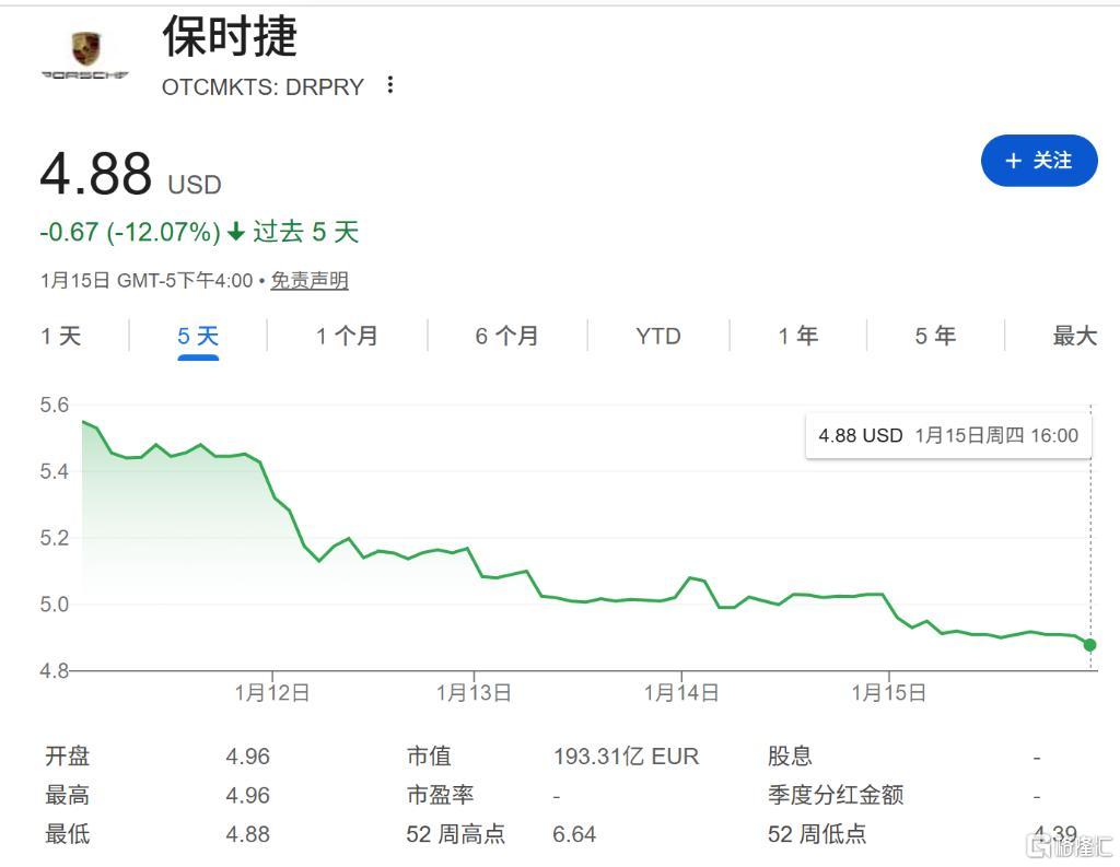 股价方面,保时捷也是承压下行。截至周五,公司股价录得自2022年IPO上市以来的最大单周跌幅,跌幅超过10%。