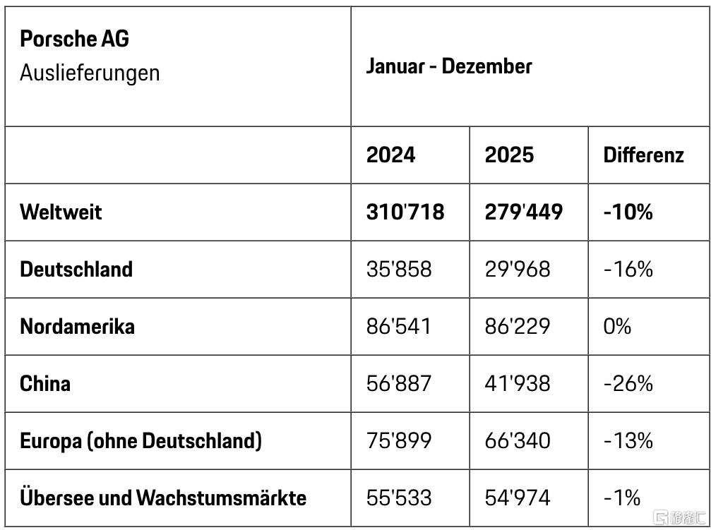 数据显示,2025年保时捷全球市场销量为279449辆,同期为310718辆,同比下滑10%。