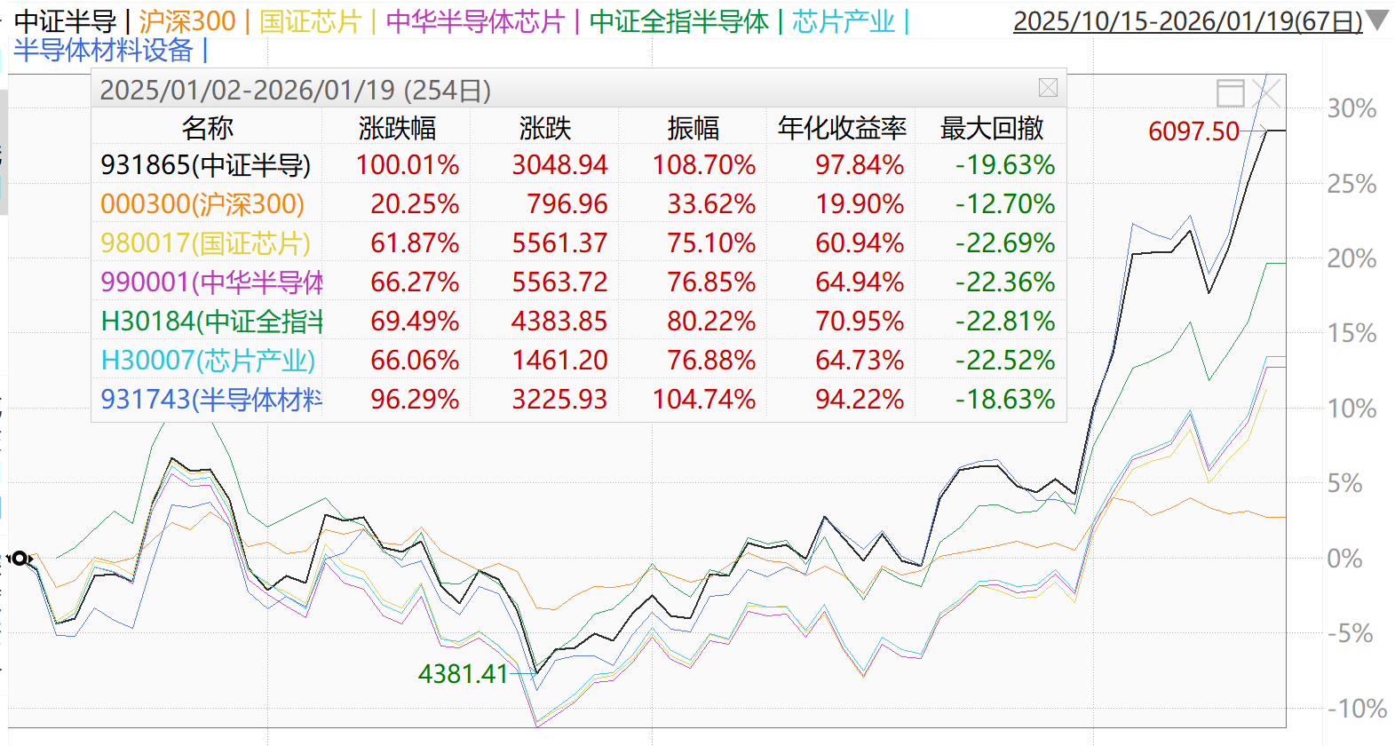 资料显示,指数前十大权重股集中度接近80%,覆盖中微公司(刻蚀设备)、北方华创(多领域设备)、中芯国际(制造龙头)、海光信息、寒武纪(AI芯片设计)、南大光电(半导体材料)等细分龙头,后续有望充分受益于国产替代成长空间。