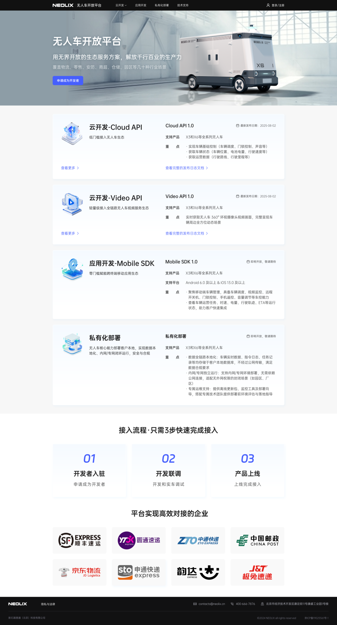 大会现场,新石器正式发布Neolix开放平台1.0。该平台面向物流、零售、安防、商超、仓储、园区等数十类行业场景,为生态合作伙伴提供统一的软件系统接口,支持车辆调度、运营状态与数据的本地化部署,并实现移动端零门槛应用开发,帮助合作伙伴快速完成系统集成与业务落地。