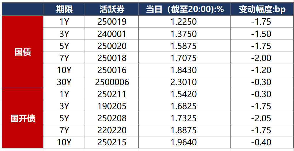1月16日,受资金面逐渐宽松、股市下跌提振,债市整体走暖。截至北京时间20:00,10年期国债活跃券250016收益率下行1.20bp至1.8430%,10年期国开债活跃券250215收益率下行0.40bp至1.9640%