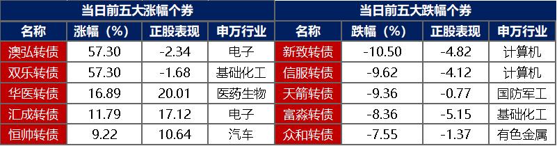 【转债市场主要指数集体上涨】 1月16日,转债市场逆势上行,中证转债、深证转债、上证转债分别收涨0.47%、0.59%、0.31%。转债市场成交额1034.80亿元,较前一交易日放量81.09亿元。转债市场个券多数上涨,388支转债中,236支收涨,139支下跌,13支持平。当日上涨个券中,新上市澳弘转债、双乐转债涨停57.3%,存量个券中华医转债涨超16%;下跌个券中,新致转债跌逾10%,信服转债、天箭转债跌逾9%。