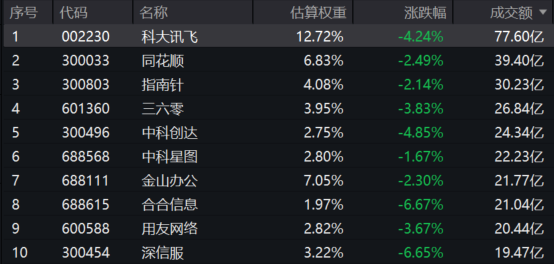 软件50ETF(159590)标的指数热门成分股中,科大讯飞、中科创达跌超4%,三六零跌超3%,同花顺、指南针跌超2%。