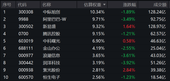 云计算ETF汇添富(159273)标的指数权重股多数飘绿:阿里巴巴-W、浪潮信息、润泽科技跌超3%,金山办公跌超2%,中际旭创、腾讯控股跌超1%。上涨方面,新易盛涨超1%,中科曙光微涨。