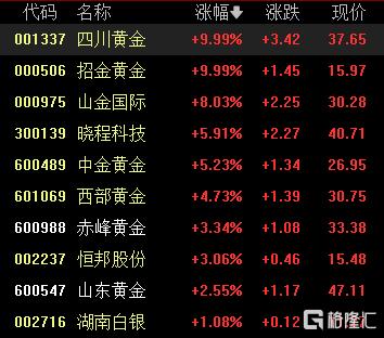 贵金属股强势,四川黄金、招金黄金涨停,山金国际涨超8%,中金黄金涨超5%,西部黄金、赤峰黄金等跟涨。