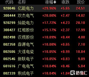 电网设备股掀涨停潮,双杰电气、汉缆股份、森源电气、新联电子、广电电气、积成电子、保变电气等超20股涨停。