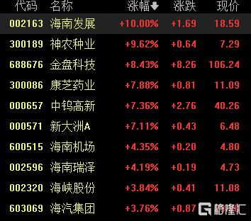 海南自贸概念股表现强势,海南发展涨停,神农种业涨超9%,金盘科技涨超8%,康芝药业、中钨高新、海南机场等跟涨。