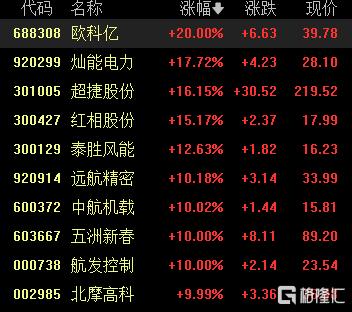 商业航天股表现活跃,欧科亿20cm涨停,灿能电气涨超17%,超捷股份涨超16%,红相股份涨超15%,中航机载、五洲新春等多股涨停。