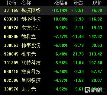 通信设备股跌幅居前,锐捷网络跌超12%,剑桥科技、东方通信跌停,德科立跌超7%,神宇股份、联特科技等跟跌。