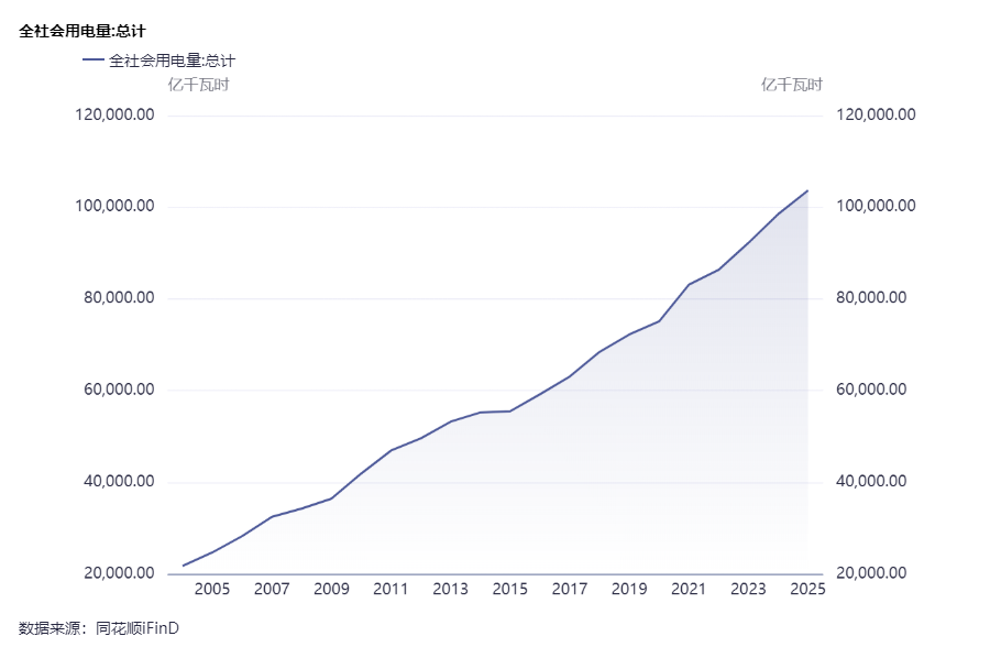 从国内来看,全社会用电量正从“温和爬坡”切换为“陡峭拉升”。国家能源局最新月报显示,2025年1—11月全国累计用电8.94万亿千瓦时,同比 7.2%,增速创2012年以来同期峰值;即便在高基数效应下,电网调度口径仍把2026—2028年复合增速锚定在6.3%—6.8%,远高于2016—2020年4.2%的平均值。