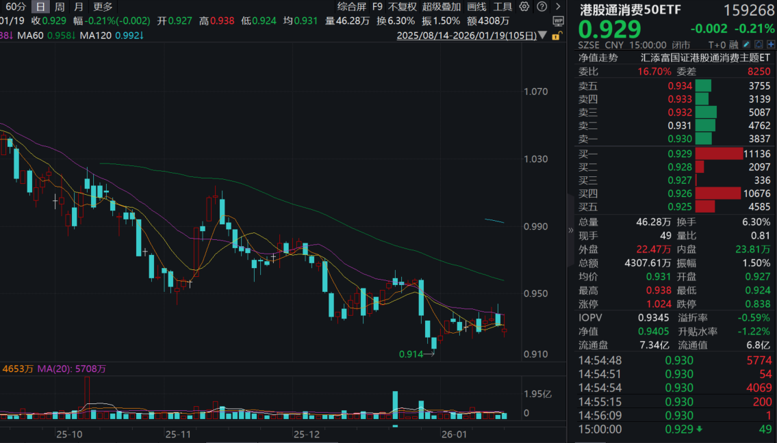 风险提示:基金有风险,投资需谨慎。投资人应当阅读《基金合同》《招募说明书》《产品资料概要》等法律文件,了解基金的风险收益特征,特别是特有风险,并根据自身投资目的、投资经验、资产状况等判断是否和自身风险承受能力相适应。基金管理人承诺以诚实信用、谨慎尽责的原则管理和运用基金资产,但不保证基金一定盈利或本金不受损失。上述产品均属于中等风险等级(R3)产品,适合经客户风险等级测评后结果为平衡型(C3)及以上的投资者。文中提及个股仅为指数成份股客观展示列举,本文出现信息只作为参考,投资人须对任何自主决定的投资行为负责。本文中的任何观点、分析及预测不构成对阅读者任何形式的投资建议。港股通消费50ETF(159268)的基金投资范围包括港股,会面临因投资环境、投资标的、市场制度以及交易规则等差异带来的特有风险。
