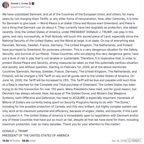 关税措施将持续实施,直至就“完全、彻底购买格陵兰岛”达成协议。